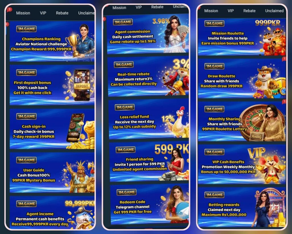 The Free 1M Game for Android has given a chance to users in Pakistan and around the globe to take benefit from rewards ad bonus sections and maximize their income. The 1M Game App latest Download offers multi bonuses and reward system e.g. App Download bonus or welcome bonuses, Login App reward, daily login bonus, weekly rewards, monthly salary bonus, first and second recharge bonus and the most importantly the referral system rewards.