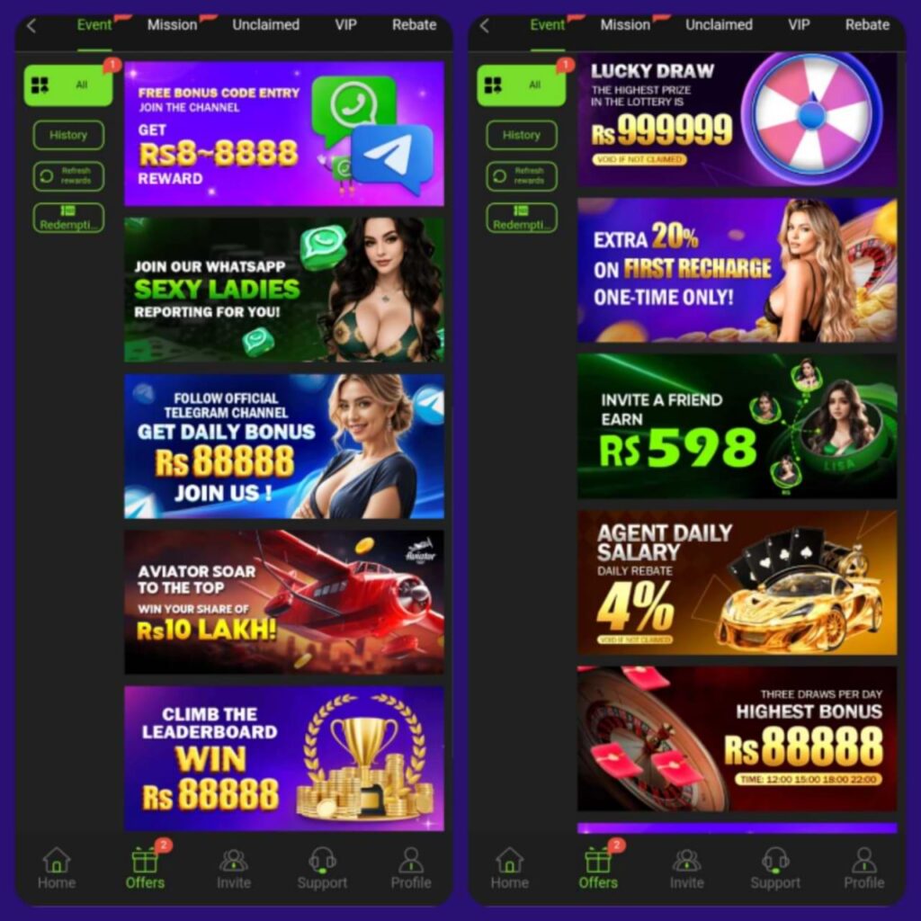 The UP786 online game App is offering mega bonuses and reward to players to play games without any special deposit like, welcome bonus, registration bonus and login into App bonus. These rewards can be claimed just after entering into game and used to play.