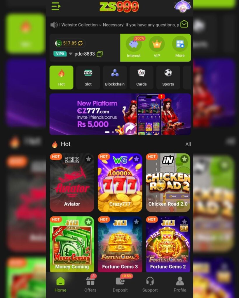 The ZS999 Game App is an online gaming app offers real money earning added as new comer in digital market. The Download ZS999 Game latest version has a tendency to provide real earning opportunities to players around the globe especially in Pakistan. The online ZS999 Game APK has an easy and players friendly main menu where all level of users can play games as per their choice.